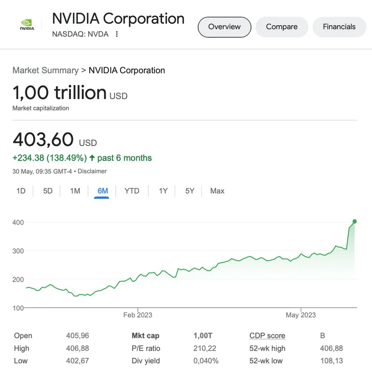 Nvidia je první čipovou společností, která se dostala do exkluzivního kola ultrahodnotných firem: dalšími americkými korporacemi s tržní kapitalizací vyšší než jeden bilion dolarů jsou internetový obchod Amazon, dodavatel iPhonů Apple, softwarová skupina Microsoft a mateřská společnost Googlu Alphabet, uvedl portál The Verge.