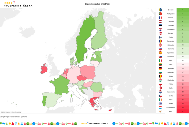 Česko patří mezi 5 zemí EU s nejhorším stavem životního prostředí. Vyplývá to z květnové analýzy 4. pilíře Indexu prosperity Česka. Při srovnání unijních zemí skrze 14 indikátorů se umístilo až na 23. místě z 27 zemí EU. V čele stojí Švédsko, naopak nejhorší je stav životního prostředí na Kypru. Překvapilo Německo, které se umístilo až na 16. místě.