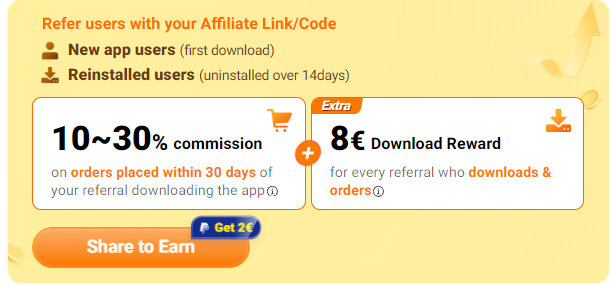 1: Získejte odměnu 8 € za každého nového uživatele, který si stáhne aplikaci TEMU pomocí vašeho doporučujícího odkazu.