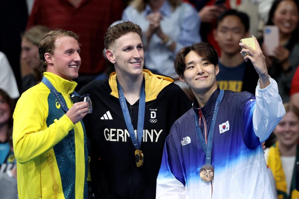 ▲ Zleva stříbrný Elijah Winnington z Austrálie, zlatý Němec Lukas Märtens a bronzový Woomin Kim z Koreje po plaveckém závodě na 400 m volným stylem.