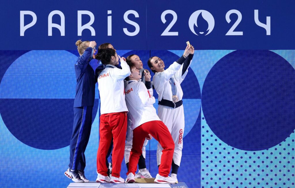 ▲ Vítězné selfie po ženských synchronizovaných skocích do vody ze třímetrového prkna. Telefonem Samsung Galaxy Z Flip6 Olympic Edition si ho pořizují (zleva) stříbrné medailistky Sarah Bacon a Kassidy Cook z USA, vítězné Číňanky Yani Chang a Yiwen Chen a bronzový pár Yasmin Harper a Scarlett Mew Jensen z Velké Británie.