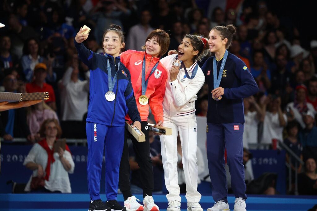 ▲ Úspěšně judistky v kategorii do 48 kg. Zleva stříbrná Baasankhuu Bavuudorj z Mongolska, zlatá Natsumi Tsunoda (Japonsko) a dvě držitelky bronzu, Shirine Boukli z Francie a Tara Babulfath ze Švédska.