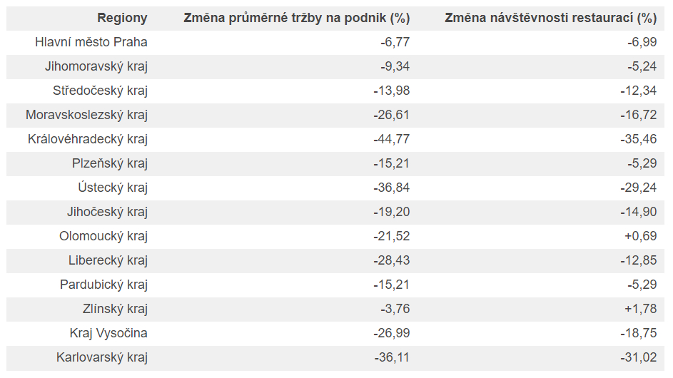 Situace se překvapivě výrazně liší také regionálně. Největší úbytek hostů i tržeb pociťují v Královéhradeckém, Karlovarském a Ústeckém kraji. Do jisté míry to kopíruje běžnou křivku sezónního provozu vybraných podniků. Co do návštěvnosti jsou nejméně zasaženy Olomoucký a Zlínský kraj.