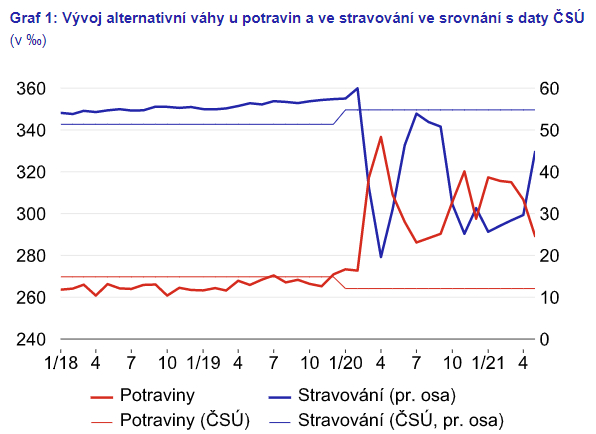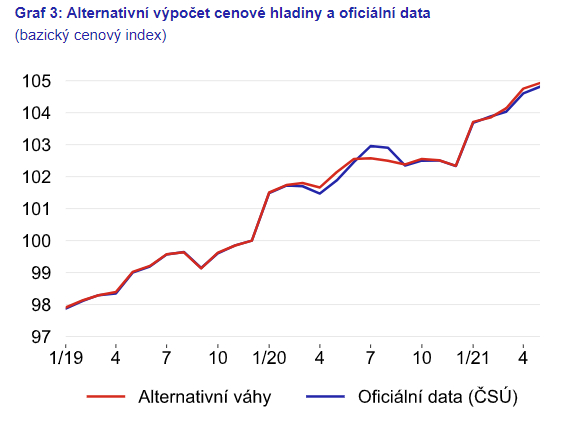Celkově lze shrnout, že během pandemie se podle očekávání struktura spotřeby významně měnila. Alternativní výpočet inflace, založený na výše popsaném odhadu vah jednotlivých položek „pandemického spotřebního koše“, nicméně naznačuje, že i během tohoto turbulentního období lze oficiální statistiky o vývoji indexu spotřebitelských cen brát v souhrnu jako dobře vypovídající.