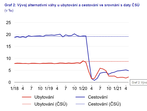 Pokud bychom na základě těchto alternativních vah a s využitím dat o vývoji cen zboží a služeb od ČSÚ spočetli alternativní ukazatel inflace během pandemie, zjistili bychom, že se dynamika těchto ukazatelů během první vlny pandemie mírně rozešla (Graf 4). Při použití alternativních vah inflace ve druhém čtvrtletí loňského roku mírně překonala oficiální údaj. K tomu přispěla především vyšší váha cen potravin, jejichž ceny v tu dobu znatelně rostly (přes 6 %). Během prázdnin se naopak alternativní inflace nacházela pod oficiálními daty. K tomu přispěl vývoj ve skupině cestování, která zahrnuje dovolené s komplexními službami (tedy ty organizované) doma i v zahraničí. Ty během léta standardně výrazně zvyšují index spotřebitelských cen, neboť dovolené během hlavní sezóny většinou citelně zdražují. Při použití alternativních (tedy znatelně nižších) vah (Graf 2) je však dopad této sezónnosti do spotřebitelských cen ve velké míře ztlumen (Graf 3). Otevření ekonomiky a z něj plynoucí snížení alternativní váhy cen potravin navíc snížilo vliv rychle rostoucích cen potravin. Po prázdninách roku 2020 se dynamiky alternativní i oficiální inflace sblížily a následně se vyvíjejí zhruba v souladu.